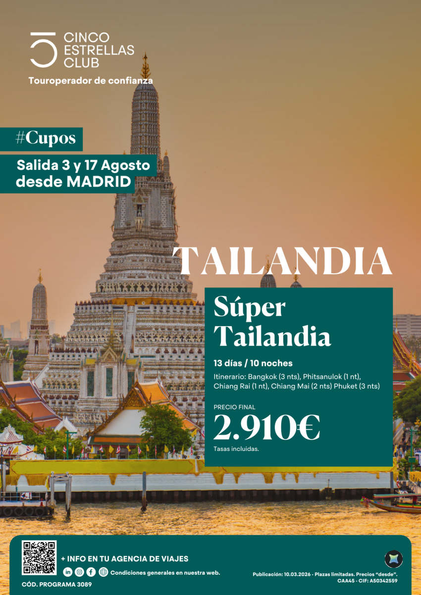 CUPOS | Súper Tailandia 13ds/10nts PVP 2.910€ salidas 03 y 17 agosto desde Madrid